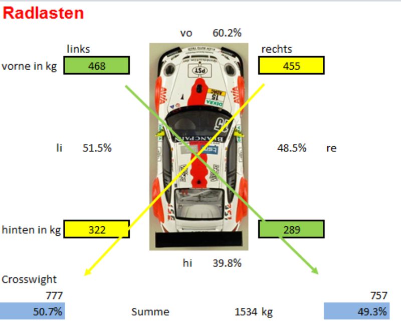 Darstellung der Radlasten und Gewichtsverteilung, inkl. Messung vom Gesamtgewicht des Fahrzeugs. ( Quelle: Racecarsuspension.ch)